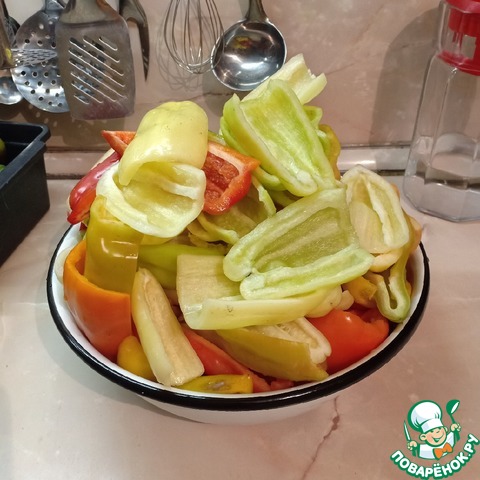 Перец вымыть, очистить от семян и разрезать пополам. Если перец крупный, то можно разрезать на 3-4 части.