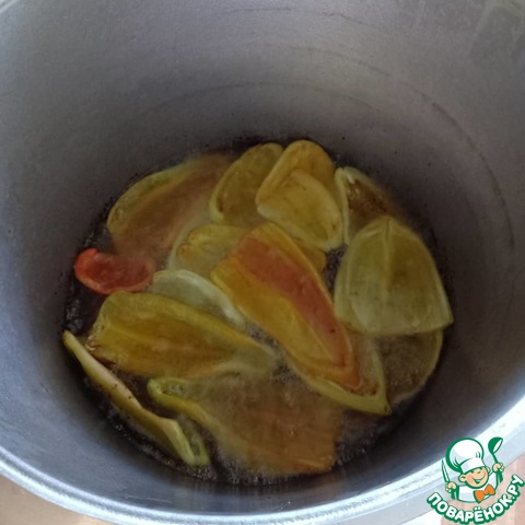 В глубокой сковороде раскалить растительное масло и обжарить нарезанный перец со всех сторон до мягкости.