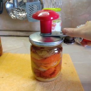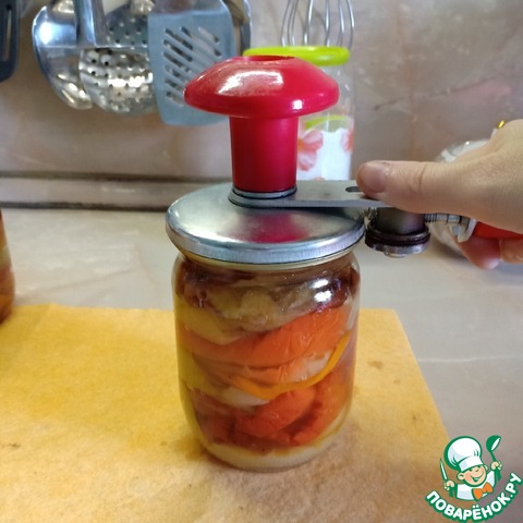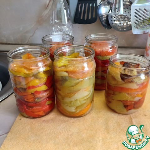 Обжаренный перец плотно уложить в заранее простерилизованные банки.