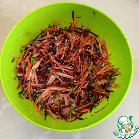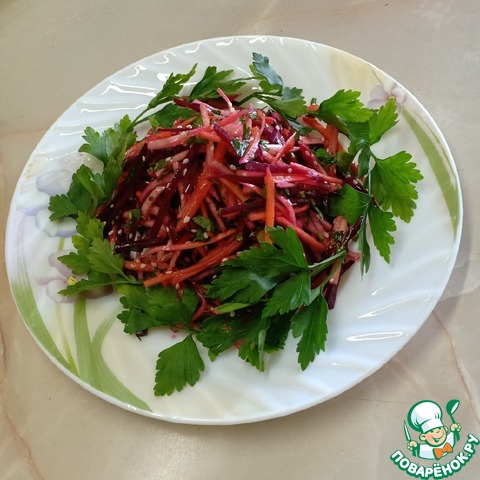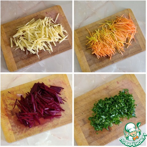 Кабачок, свеклу и морковь натереть на терке для моркови по-корейски или нарезать тонкой соломкой. Петрушку мелко покрошить.