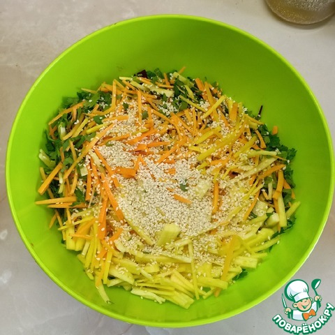 Вкусный и очень полезный салат для вашего меню. Как раз недавно спрашивали рецепт салата с кабачками, заявка выполнена.