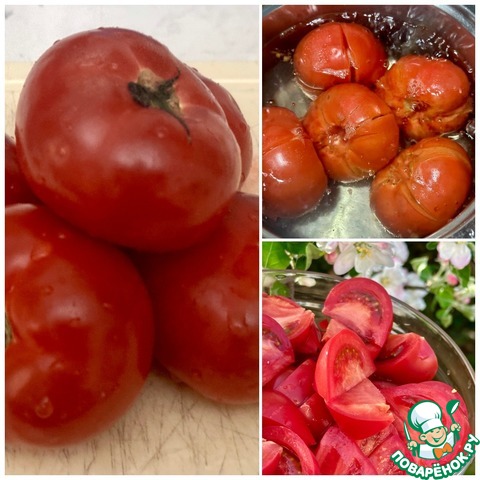 Как приготовить помидоры для закладки в кастрюлю – дело вкуса. Можно просто крупно нарезать. Можно ошпарить и очистить. Я делал и так и этак.