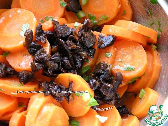 Добавьте нарезанный чернослив, перемешайте. Уберите салат в холодильник минимум на 1 час.