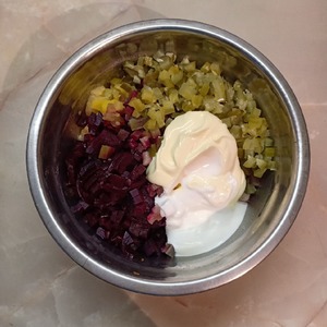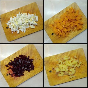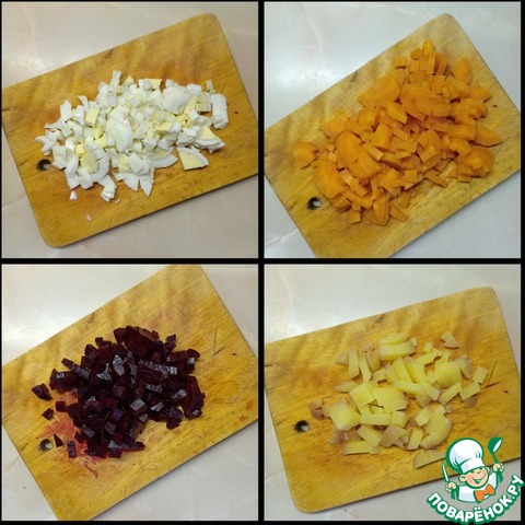 Свеклу, морковь, картофель и яйца очистить и нарезать средними кубиками. Часть свеклы не забудьте оставить для украшения салата.