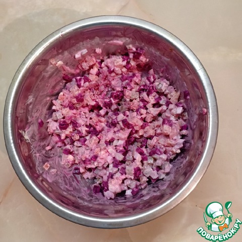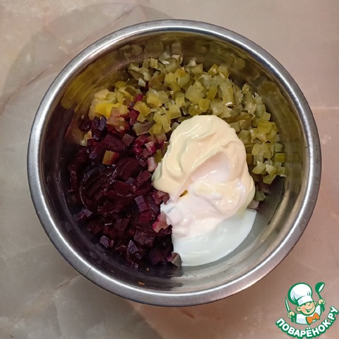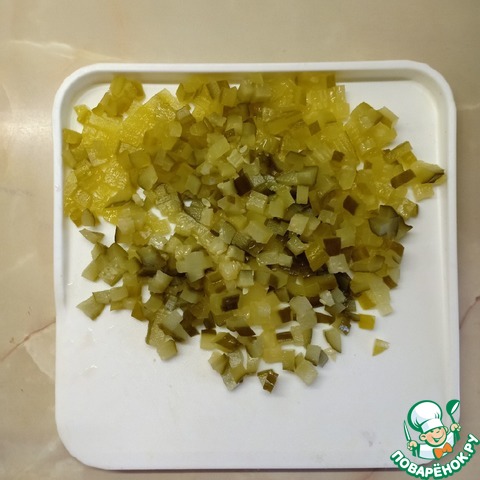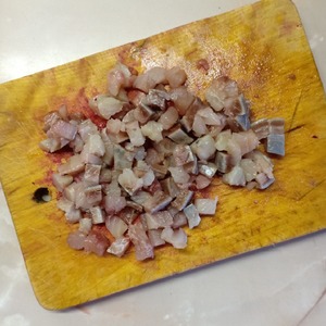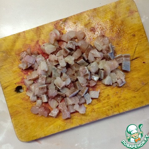 Сельдь очистить, аккуратно вынуть мелкие кости и нарезать кубиками.
