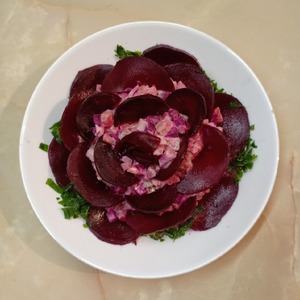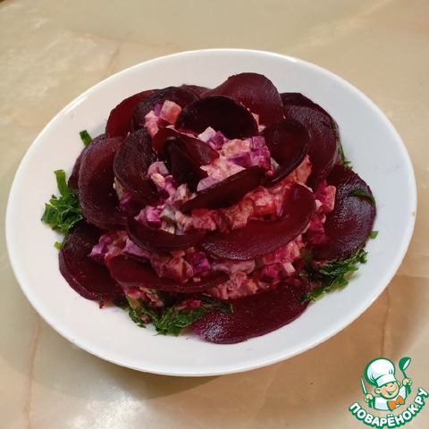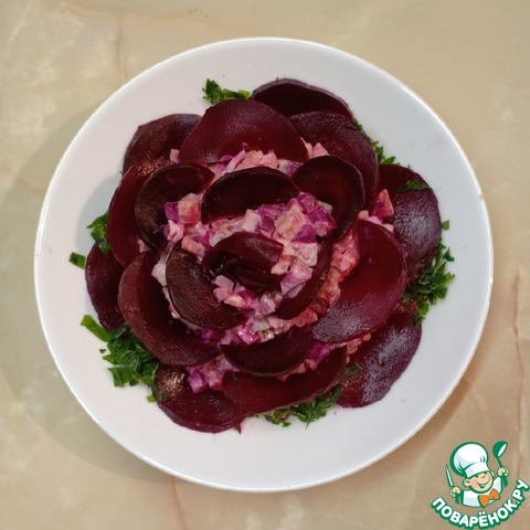 Салат выложить горкой на плоское блюдо. Оставшуюся свеклу нарезать тонкими кружками. Вставить кружки свеклы в салат, имитируя лепестки розы. Наверху свернуть свекольные лепестки в бутон. Украсить листиками петрушки.