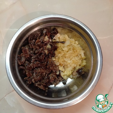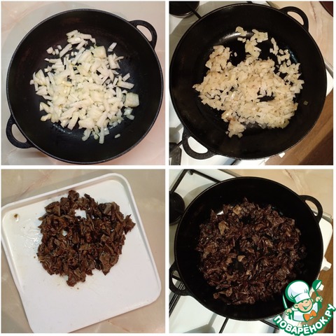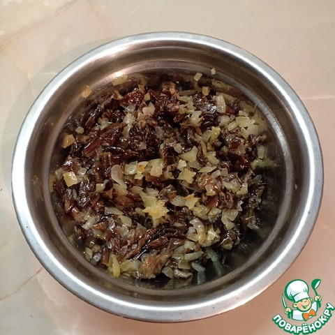 Грибы нарезать ломтиками и обжарить на растительном масле. Три луковицы мелко нарезать и отдельно обжарить на растительном масле.