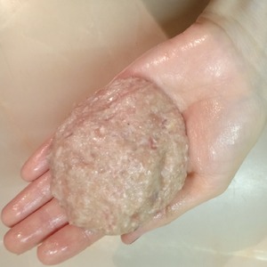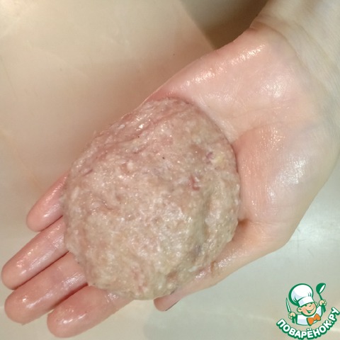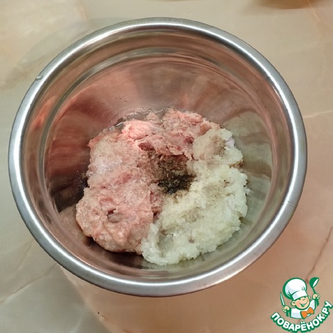 В фарш добавить оставшийся лук, пропущенный через мясорубку, соль, перец по вкусу, влить немного холодной воды, перемешать.