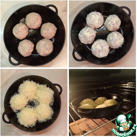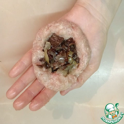Из фарша сформовать шарики. В каждом сделать углубление, наполнить его луково-грибной начинкой и завернуть в котлету.