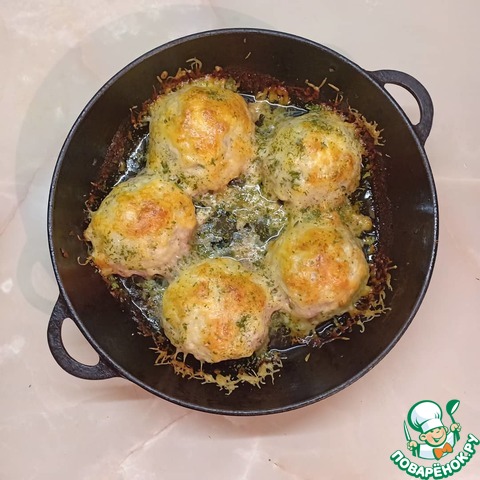 Выложить "гнездышки" в форму доя запекания, смазать майонезом, посыпать натертым на мелкой терке сыром, влить в форму 1-2ст. л. воды и запекать 20-25мин в духовке, заранее разогретой до 220С.