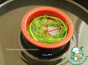 Подготовьте пароварку: наполните резервуар для воды до отметки максимального уровня. Установите на место поддон для капель. В контейнер для специй положите веточку укропа.