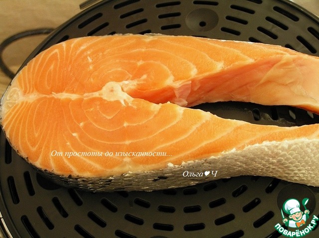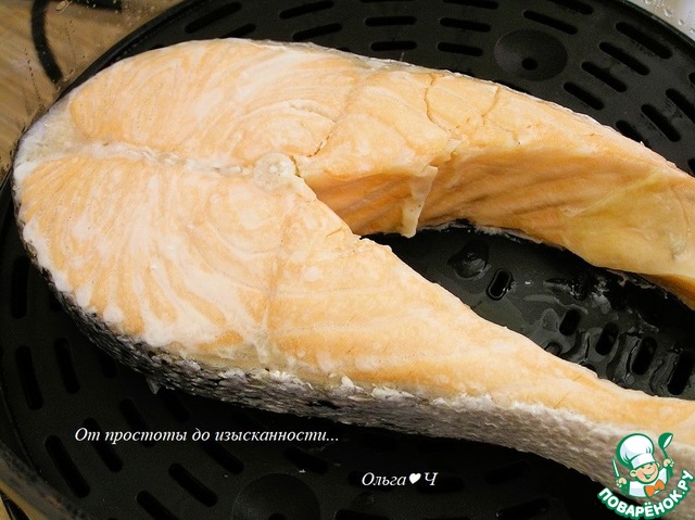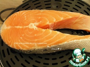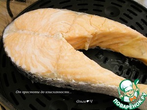 В чашу № 1 положите филе лосося (у меня стейк). Накройте крышкой. Включите пароварку, выберите время приготовления 6 минут. Нажмите кнопку пуска. *Это я делаю для того, чтобы лучше отделилось филе лосося от костей и кожи.