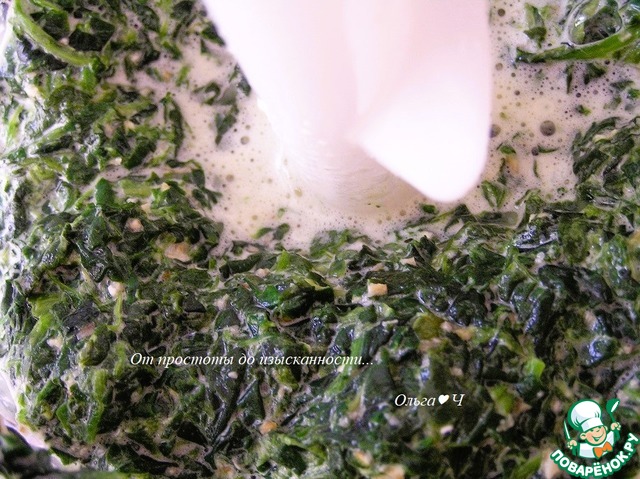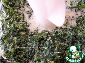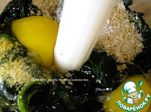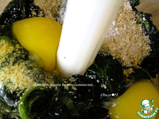 Шпинат соедините в чаше блендера с двумя яйцами, солью и перцем, добавьте 2 ст. л. хлопьев.
