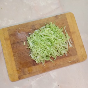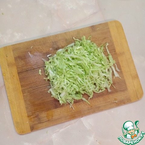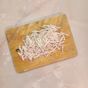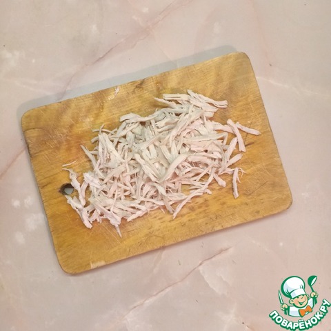 Отварное мясо или ветчину нарезать соломкой. Если вы будете использовать мясо, то его лучше руками разделить на волокна, так салат будет нежнее.