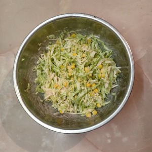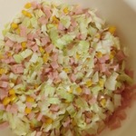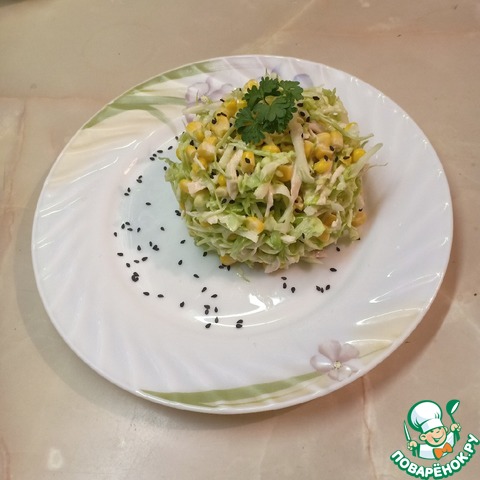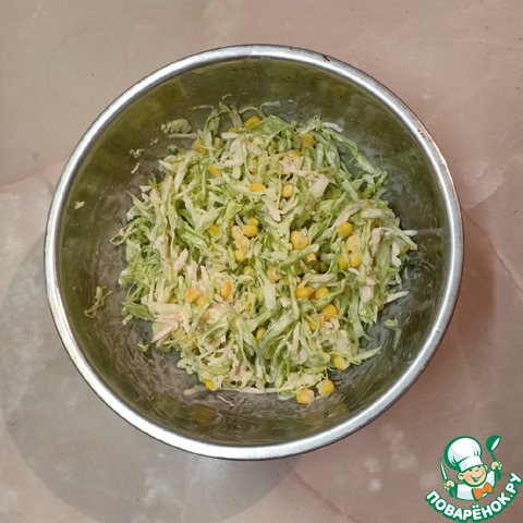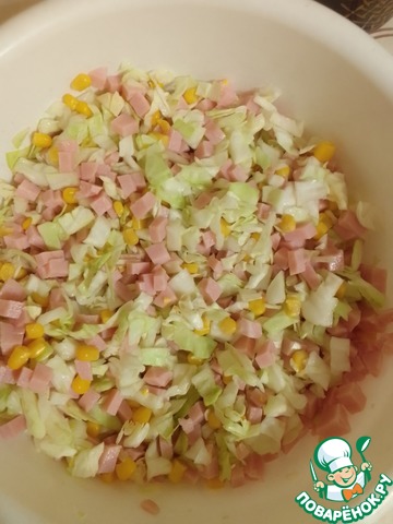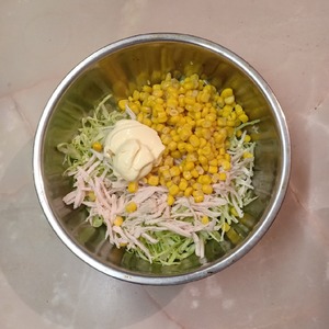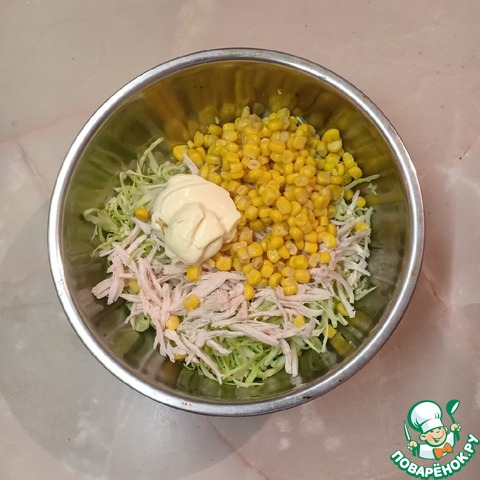 Кукурузу откинуть на дуршлаг, чтобы удалить излишки жидкости. Выложить капусту в салатницу, добавить ветчину и кукурузу. Посолить, заправить майонезом и все хорошо перемешать.