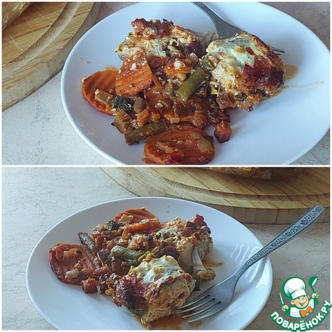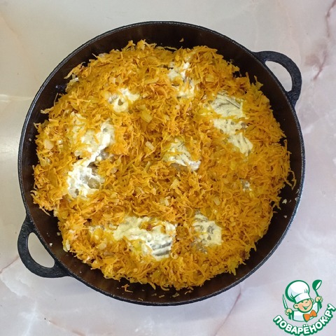 Сверху выложить морковь с луком и запекать 20-30мин в духовке, заранее разогретой до 180С.