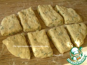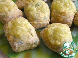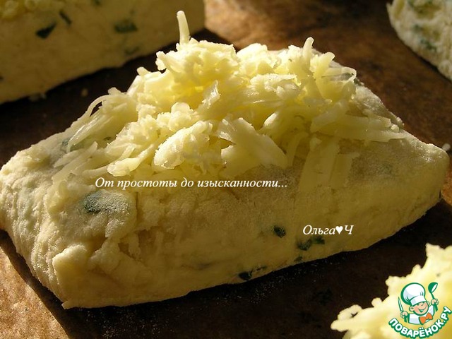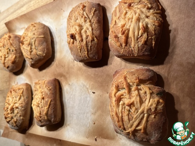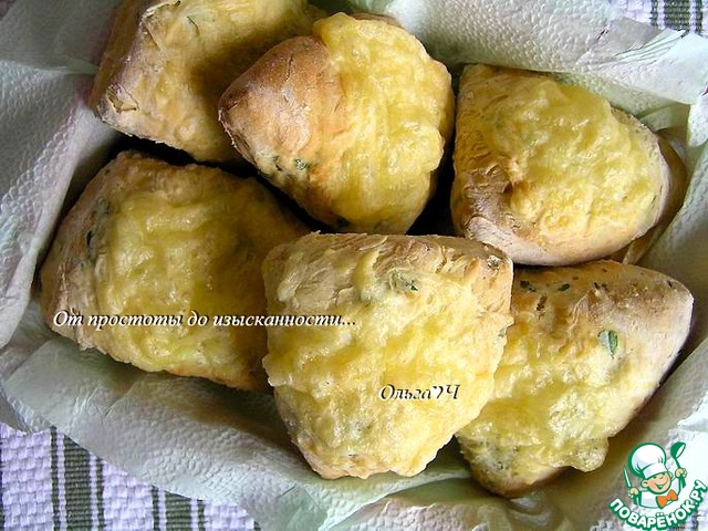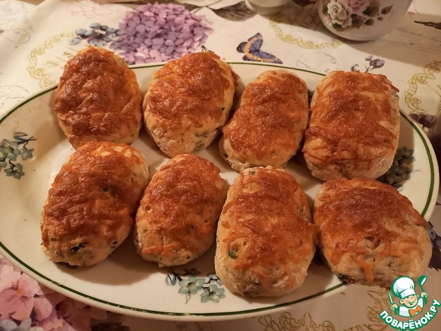Переложите булочки на противень, застеленный бумагой для выпечки, сверху на каждую заготовку выложите тертый сыр.