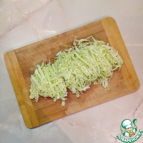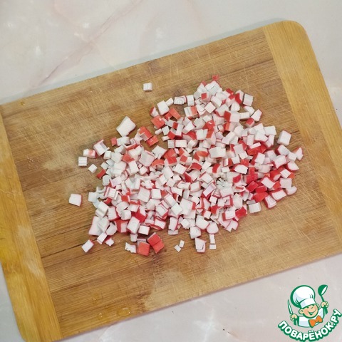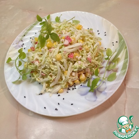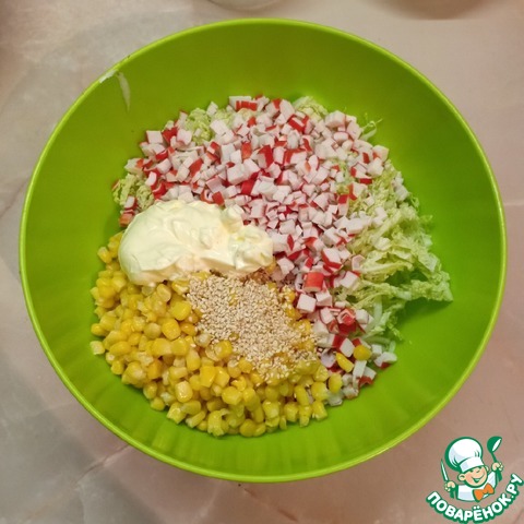 Соединить в глубокой миске капусту, крабовое мясо, кукурузу и обжаренные семена кунжута, посолить и заправить майонезом.