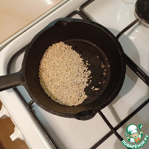 Кунжут обжарить до золотистого цвета на сухой сковороде (не пережаривать!).