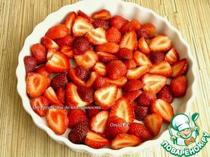 Клубнику промойте, обсушите, нарежьте на 2-4 части, уложите в форму (у меня 19 см), смазанную маслом.
