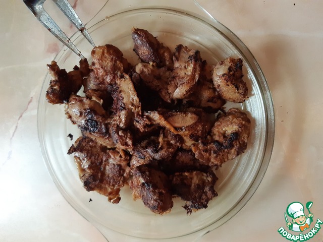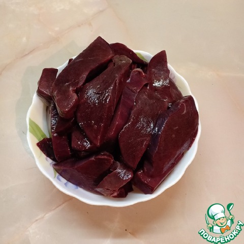Печень промыть, удалить пленки и нарезать средними кусочками.