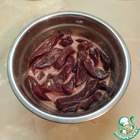 Выложить в эту смесь печень и подержать в маринаде не меньше 40мин, а лучше 1-1,5ч.