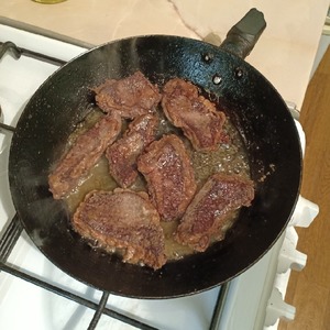 Замаринованную печень обжарить на хорошо разогретой сковороде в небольшом количестве растительного масла до готовности. Получается очень вкусная печеночка.