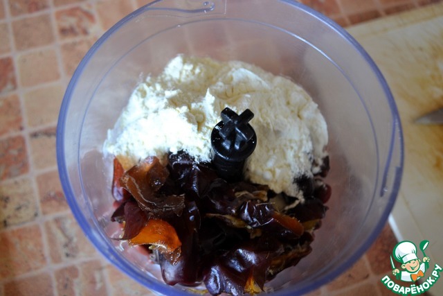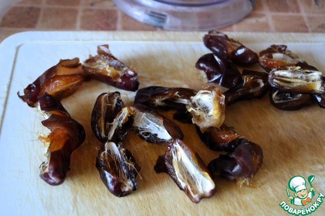 Финики замочить в воде на час. Промыть. Удалить косточку.