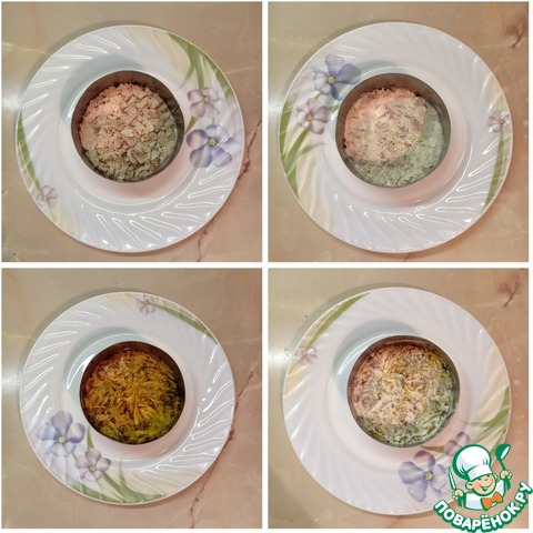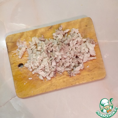 1-й слой - мелко нарезанное куриное филе;