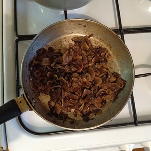 Шампиньоны нарезать пластинками и обжарить.