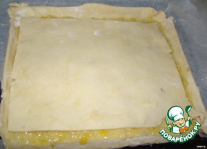 Делим тесто на три части... две одинаковые побольше... и одну в середину поменьше... Раскатываем первый слой... и выкладываем его на противень на кулинарную бумагу... сверху выкладываем половину лимонно-ананасовой массы