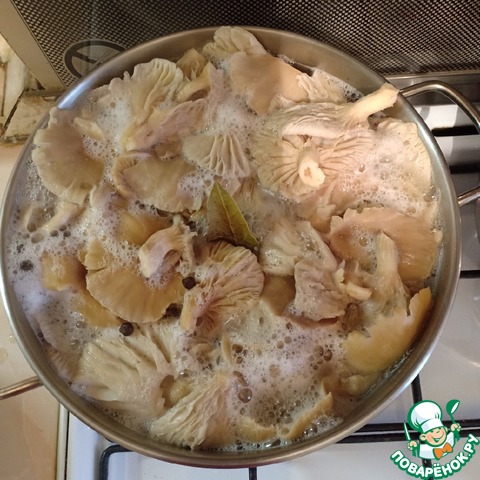 Грибы залить водой, поставить на сильный огонь и дать закипеть. Когда грибы закипят, огонь убавить, добавить соль по вкусу и специи, варить 15мин.