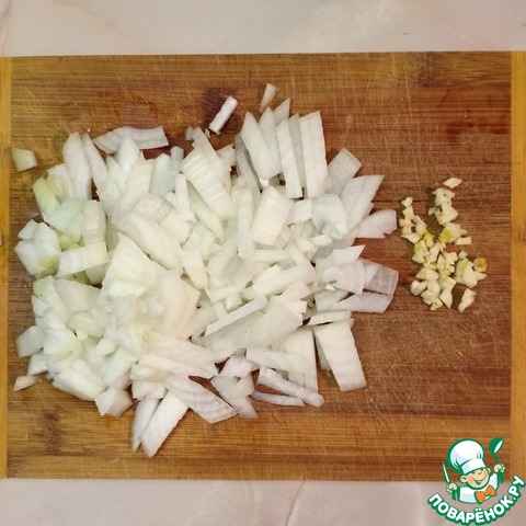 Почистить и мелко порезать лук и 1 зубчик чеснока.