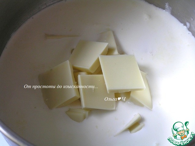Приготовьте ганаш. Сливки доведите почти до кипения, добавьте поломанный на кусочки белый шоколад, перемешайте до однородности.