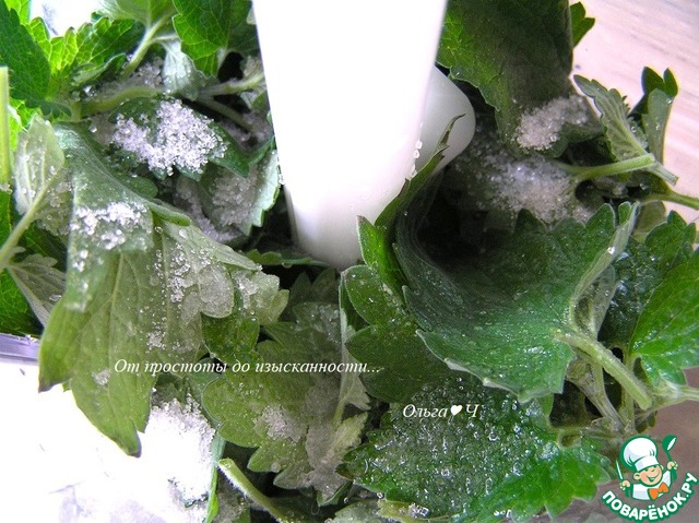Добавьте измельченные листья мяты, перемешайте. По желанию добавьте немного пищевого красителя.