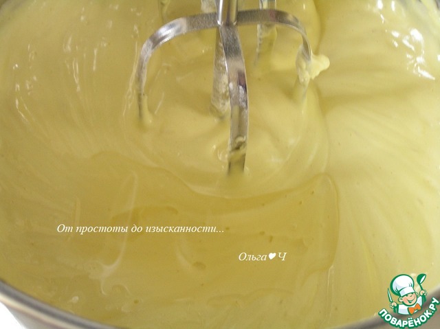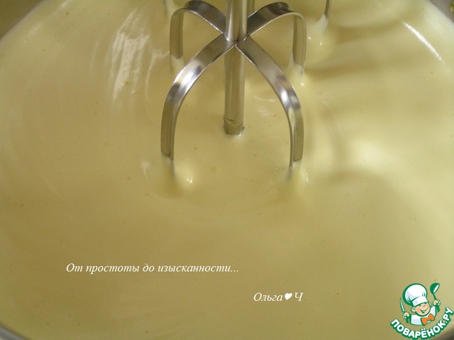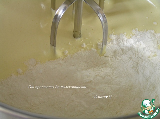 Добавьте муку, смешанную с разрыхлителем. Взбейте.