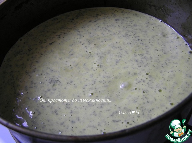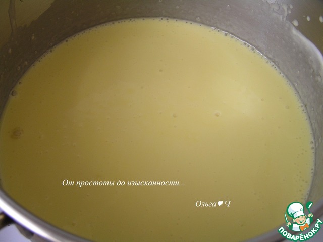 Влейте мятное молоко в яичную массу, перемешайте, перелейте все обратно в кастрюльку (для быстроты я использовала 2 кастрюльки и не переливала). Постоянно помешивая венчиком, снова доведите массу до 85°. ***Этот крем очень нежный, главное — не переварить, поскольку при 86° желтки сворачиваются. Но если желтки у вас все-таки сварились, то нужно процедить крем через сито.***