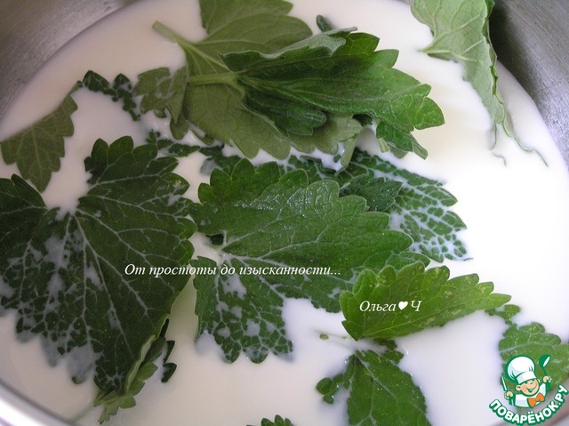 Приготовьте баварский мятный мусс. Желатин замочите в 50 мл молока до набухания. Оставшееся молоко (125 мл) разогрейте почти до кипения вместе с листиками мяты (если есть градусник, то до 85°, если нет, то когда от молока начнет подниматься пар), оставьте на 5-7 минут, затем процедите, мяту отожмите.