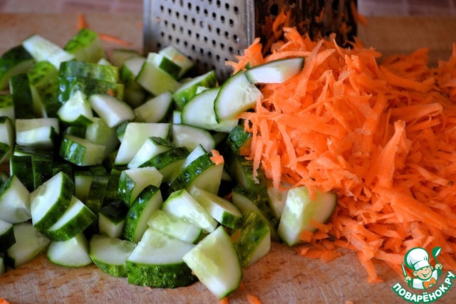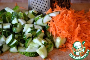 Морковь натереть на терке. Огурцы нарезать на четвертинки.