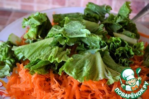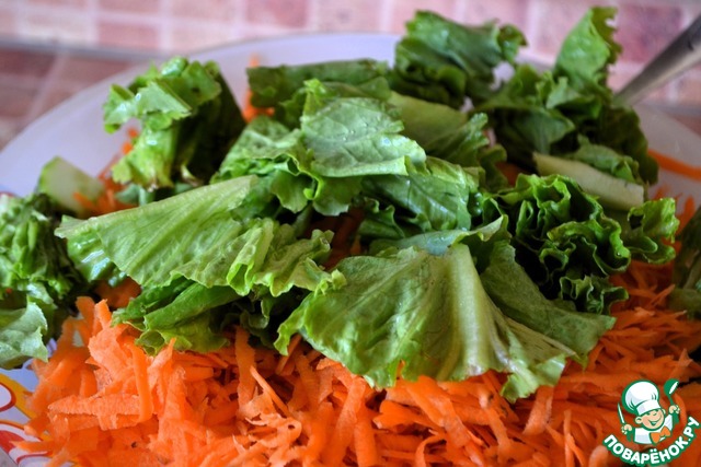 Листья салата промыть, обсушить, порвать руками.