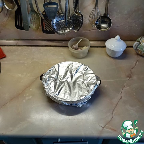 Накрыть форму с бедрышками фольгой (можно налить немного воды, так курица будет сочнее) и поставить в духовку на 30-35мин, заранее разогретую до 200С. Затем фольгу снять и продолжить запекать еще 15мин, до образования красивой корочки.