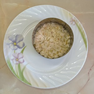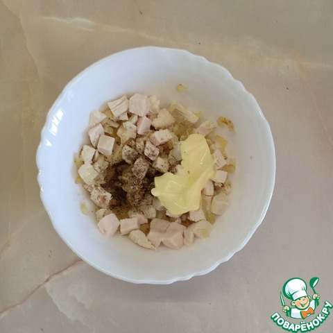 К куриному мясу добавить обжаренный репчатый лук, ввести немного майонеза, посолить и поперчить по вкусу, перемешать, выложить в глубокий салатник и слегка утрамбовать.