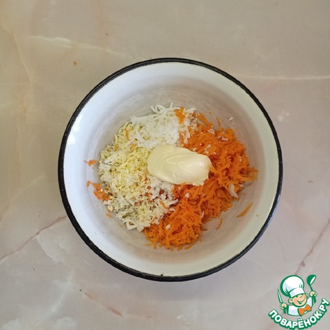 Яйца и морковь натереть на терке (крупно или мелко - на ваше усмотрение), переложить в миску, добавить немного майонеза, посолить, поперчить, перемешать, выложить в салатник на предыдущий слой.