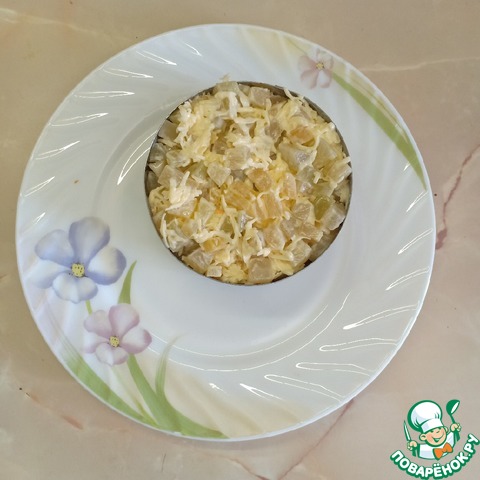 Консервированные ананасы нарезать небольшими кубиками, твердый сыр натереть мелкой стружкой. Соединить ананасы и сыр, добавить немного майонеза и перемешать. Выложить сыр и ананасы завершающим слоем. По желанию, салат можно посыпать измельченными грецкими орехами или арахисом. Настоять салат несколько часов и можно его подавать к столу.