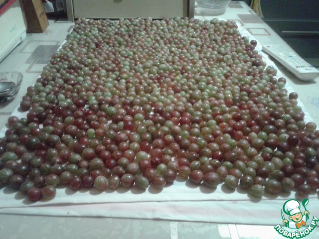 Теперь так же крыжовник. Самая большая потеря времени этот этап. Делала его накануне вечером. Очень долго обрывала все хвостики у них. Оставила на ночь на простыне сушиться.