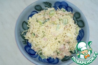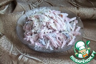 Салат уже можно подавать к столу, но я люблю когда сверху ещё добавлен сыр, поэтому добавляем 50 г тертого сыра.