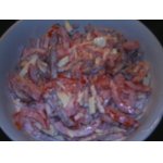 4. Для заправки: 5 ст. л растительного масла соединяем с 1 ст. л лимонного сока,1 ст. л сметаны,1 ч. л горчицы и всё хорошо перемешиваем, добавляем 1ч. л сухого чеснока, а также соль вкусу, ещё раз перемешиваем.