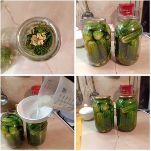 Затем воду слить в кастрюльку (предваоительно замерив объем) и закипятить с солью и сахаром. В банку влить эссенцию и сразу же залить кипящим маринадом. Закатать простерилизованными крышками и укутать до полного остывания.