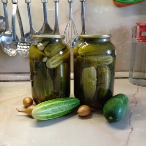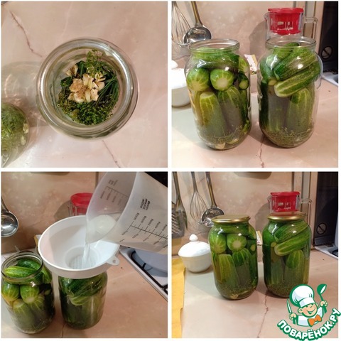 Огурчики получаются хрустящими, с нежным сладковатым вкусом. Данной порции маринада хватает на 7 литровых баночек.