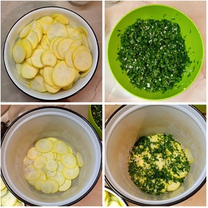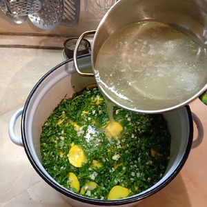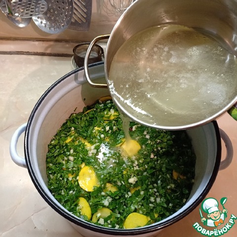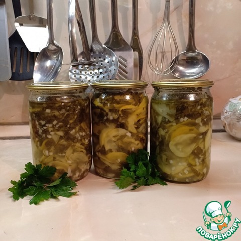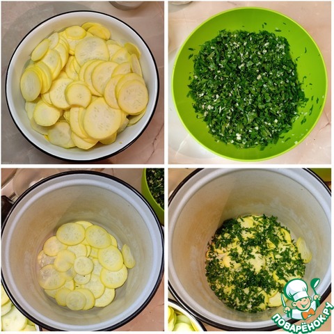 Кабачки очистить, мелкие нарезать очень тонкими кружочками, более крупные разрезать вдоль пополам и нарезать поперек ломтиками, как можно тоньше. Плотно уложить в эмалированную кастрюлю, прослаивая рубленой петрушкой и измельченным чесноком.